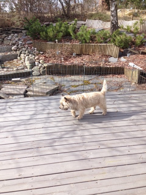 Kauppareissun jälkeen tulin kotiin ja kaivoin varastosta etupihalle kalusteet ja otin esille pressun alta takapihan kalusteet ja grillin. Mikäs siinä oli loikoillessa takapihalla sohvalla, kun aurinko paistoi lämpimästi. Koirakin nautti, kun sai taas kulkea ihan vapaasti sisälle ja ulos. Makoili välillä auringossa ja välillä oli pakko tunkeä pää pensaaseen, koska sisiliskot rapistelivat siellä. En ole ihan varma oliko ne jo heränneet, vai luuliko koira vaan. Kovasti kuitenkin oli jahtaavinaan niitä.