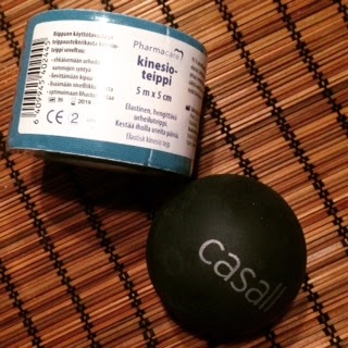 Samalla reissulla ostin myös kotiin Kinesioteippiä, koska tuo faskiittialue on nyt teipattuna. Kohtahan meiltä löytyy kaikki huoltoon ja hoitoonkin tarvittavat välineet. Toivottavasti vaan ei tarvitse käyttää niitä turhan usein.