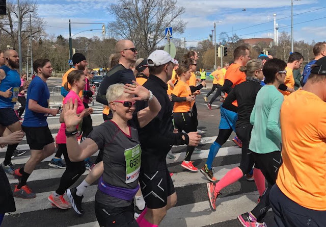 Olin neljännessä lähtöryhmässä ja kun ensimmäinen ryhmä lähti matkaan tasan kello 15 oli meidän starttiaika klo 15:30. Ohjatut alkulämmittelyt ja sen jälkeen ryhmittäytyminen lähtökarsinaan. Pientä liikettä ja paljon puheensorinaa. Lopulta se lähtölaukaus tuli. Mies ja kuopus olivat heti lähdön jälkeen jalkakäytävällä vielä toivottamassa hyvää matkaa. Alkumatkasta ensimmäiset 5 km meni aika pitkälti isossa porukassa, mitä nyt letka pikkuhiljaa piteni. Välillä ohitin itse jonkun ja välillä joku tuli ohi. Kuten pitkin koko matkan.