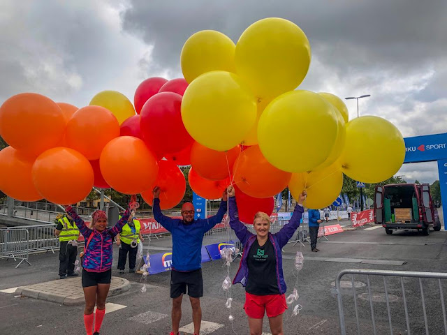 Toki olimme jo muutenkin mukana ennakkojärjestelyissä jonkin verran, kun kasasimme juoksukoulusta jäniksiä mukaan, iso kiitos heille ja muillekin jäniksille. Vielä kisa-aamuna kävimme noutamassa jänisten ilmapallot paikallisesta leluliikkeestä. Onneksi saimme mukaan yhden lisäjäniksen, sillä reilun 30 suuren heliumilla täytetyn ilmapallon siirtäminen tuulisessa säässä olisi kahdestaan ollut hieman haastavaa.