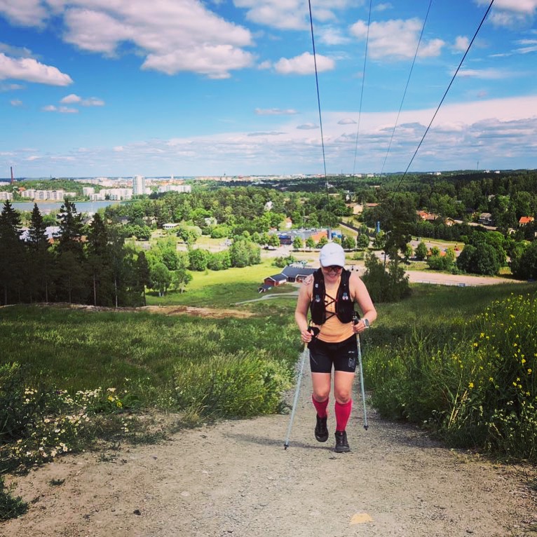 Sunnuntaina jatkui juoksuputki ja aamupäivällä suunnattiin auton keula kohti Hirvensalon laskettelurinnettä ja mukaan otettiin polkujuoksukengät, juotavaa juoksuliiviin ja sauvat. Aurinkokin oli sopivasti saapunut Turun seudulle ja lämpötila alkoi nousta kohti hellelukemia.