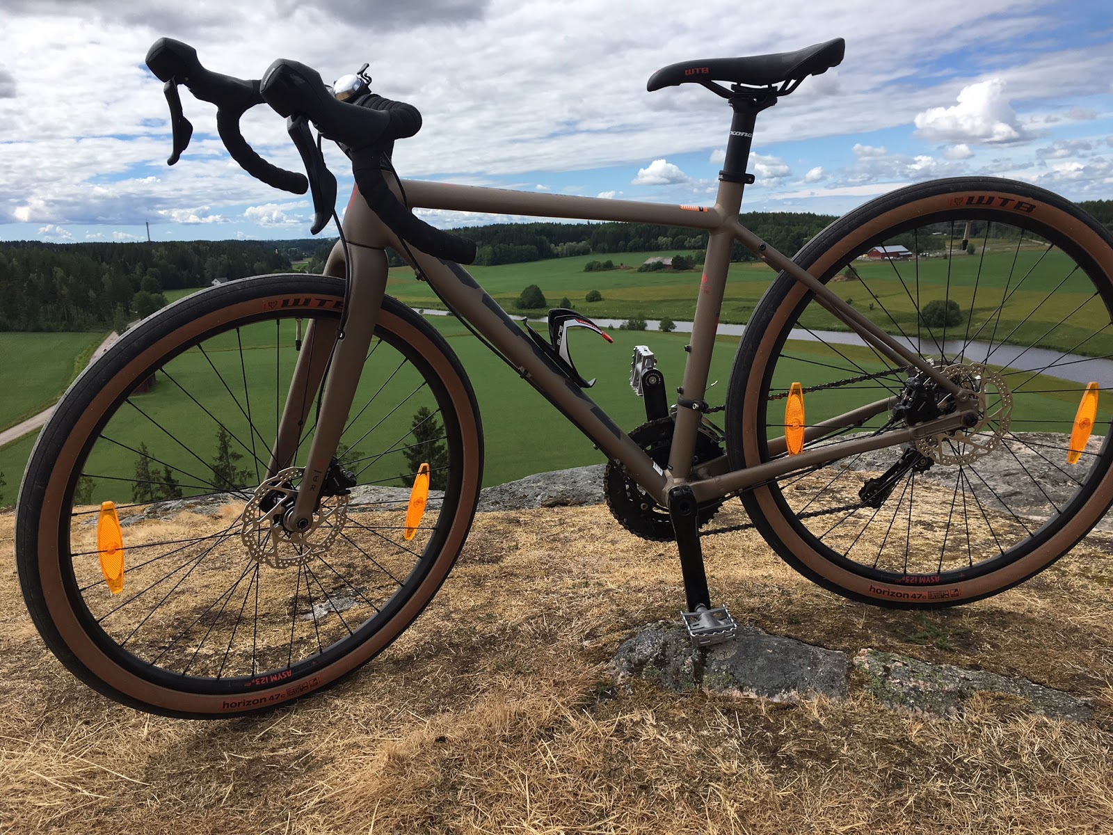 Juhannuspäivänä tehtiin pitkä ja rauhallinen pyörälenkki Liedon Vanhalinnan Linnavuoren kautta jatkuen pienellä tankkaustauolla kauniissa Nautelankosken maisemissa. Loppumatka menikin lähes kokonaan vastatuuleen polkiessa Paattisten, Vahdon ja Ruskon kautta takaisin kotiin. Matkaa kertyi lopulta 67 kilsaa ja voin sanoa, että kotiin tullessa jaloissa tuntui. Linnavuorelle oli päätetty kiivetä ihan ylös saakka ja koska pyörien lukkoja ei ollut mukana piti keksiä jotain muuta. Heitin pyörän olkapäälle ja kävelin portaat ylös. Onneksi tuli hankittua kevyt alumiinirunkoinen pyörä 😀