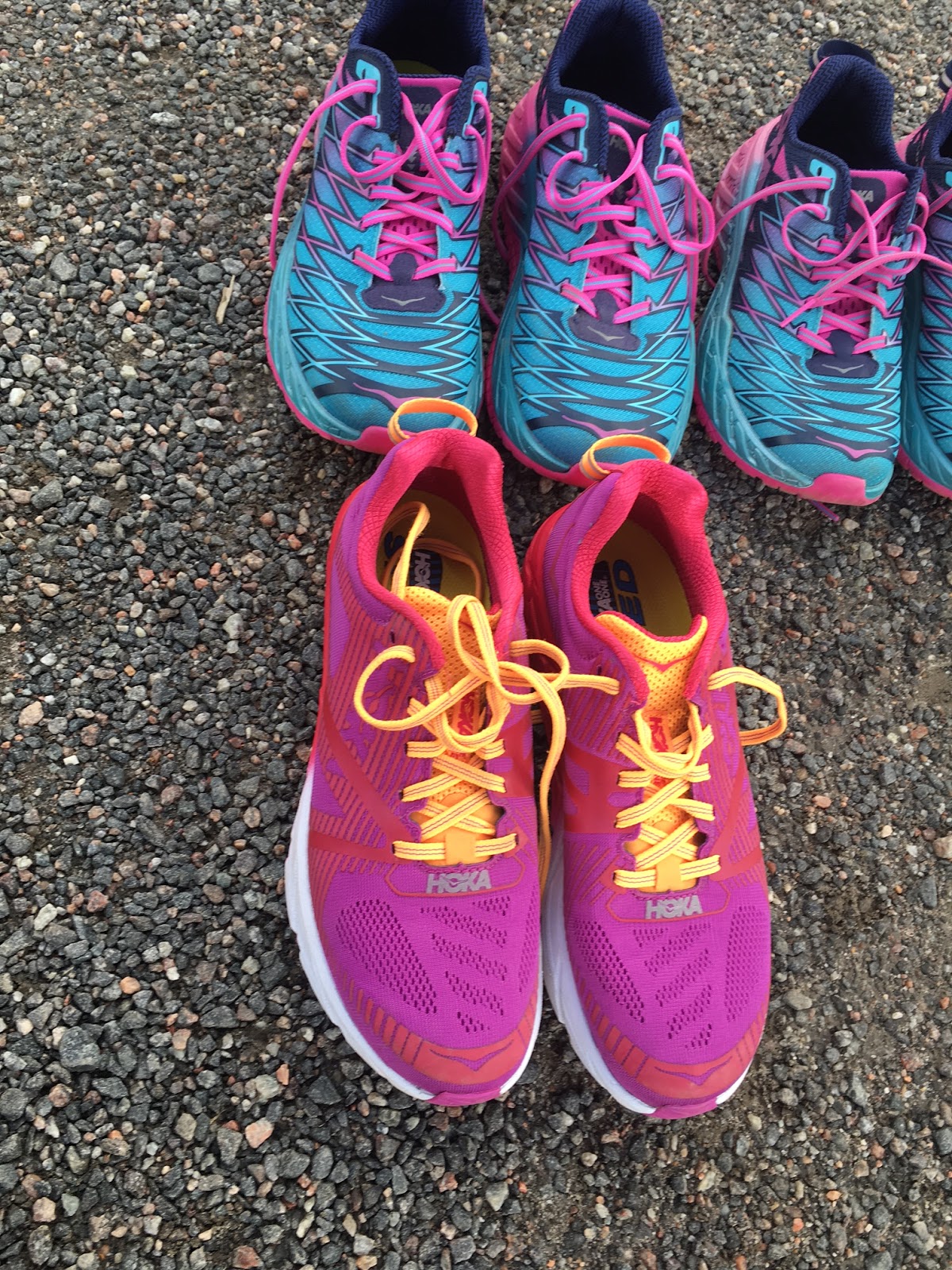 | Rivi ihanan värikkäitä juoksukenkiä (vas.pinkki Tracer2 / kesk. sininen Clayton2 / oik. pinkki ja alla vihreä Clifton4) |