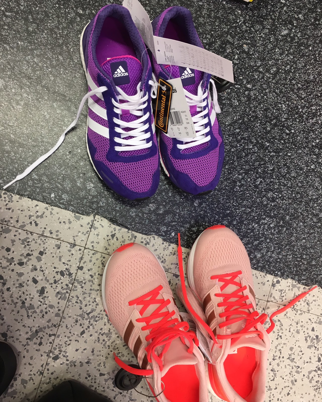 Toiset suosikkini Adidaksen Boston Boostit tulivat viime syksynä Tallinnan maratonin jälkeen tiensä päähän. Niissä on vaimennus päässyt huononemaan ja sen tuntee hyvin juostessa. Ostin syksyllä uudet juoksukengät ja arvoin Bostoneiden ja Adioksien välillä kauan ja lopulta väri ratkaisi. Halusin ostaa kengät silloin heti ja Bostoneista oli tarjolla vain ihan vaaleanpunainen kenkä, ei pinkki vaan haalea vaaleanpunainen. Adioksista taas oli liila kenkä, joka miellytti silmääni enemmän kuin vaaleanpunainen, joten ostin Adiokset.