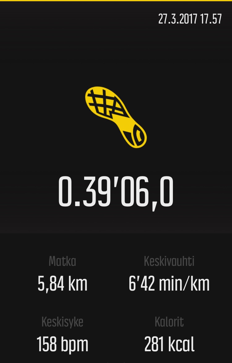 Olin pelännyt ensimmäistä juoksua flunssan ja yskän jälkeen, koska välillä hengästyn pelkästä portaissa kävelystä. Myös todella paha katupöly ja täällä etelässä alkanut siitepölykausi mietityttivät. Aloitin allergialääkkeiden ottamisen jo sunnuntaina. En kuitenkaan juoksun aikana miettinyt yhtään sitä itse juoksemista, päässä pyöri muut päivän asiat. Vastatuuleen juostessa vauhti pyöri lähellä 7:00 min/km ja yhden ylämäen kävelin, jottei sykkeet nousisi liikaa heti alkumatkasta. Pahimmasta vastatuulesta ja ylämäestä selvittyäni huomasin yllättäen vauhdin olevan jo 6 min/km eikä tuntunu missään. Paitsi, että sykkeet oli hieman korkeat, mutta entä sitten 😀