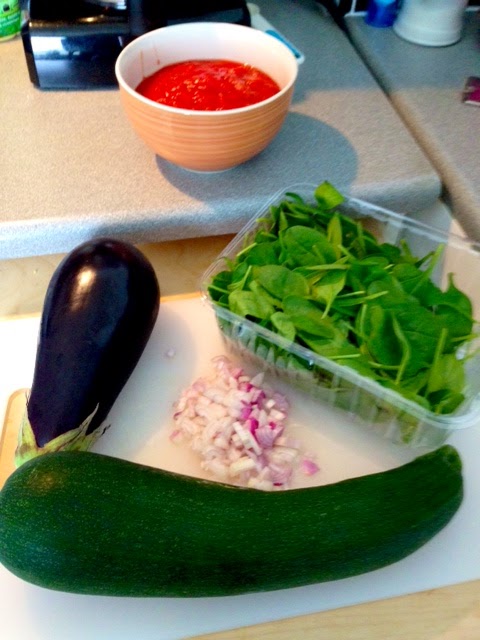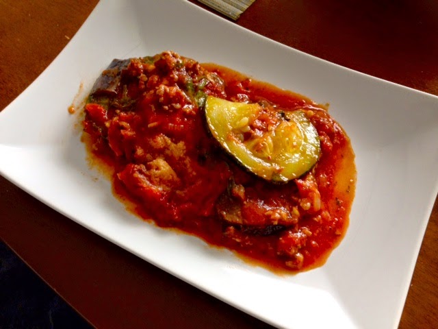 Paistoin munakoiso- ja kesäkurpitsaviipaleet oliiviöljyssä. Kasasin uunivuokaan ensin jauheliha-tomaattisekoitusta, päälle munakoisoa, kesäkurpitsaa ja pinaattia. Vähän juustoa ja uusi kerros jauhelihaa ja kasviksia. Vimeisenä kerroksena oli jauheliha-tomaattisekoitusta ja juustoa.