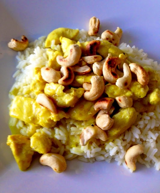Siihen laitoin siis maustamattomia kanafileitä, sipulia, kurkumaa, chilijauhetta, mustapippuria, suolaa, banaania, kookosmaitoa, sitruunamehua ja cashewpähkinää. Paistoin sipulin ja kanapalat kookosöljyssä ja ripottelin mausteet jo alkuvaiheessa mukaan. Muusasin banaanin ja kaadoin sen päälle kookosmaidon ja sitruunamehun ja sekoitin koko setin ja kaadoin kanapalojen päälle. Cashewpähkinät paahdoin kuivalla pannulla ja annoin jäähtyä hetken ennen tarjoilua. Lisäksi keitin riisiä kanan kaveriksi.