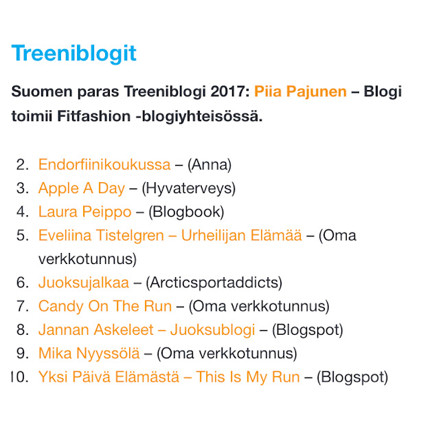 Ilahduin ja voin myöntää, yllätyin viime viikolla, kun löysin blogini listattuna Suomen suosituimpien blogien joukosta, treeniblogien kategorian top 10:stä. Olin päivän pari aiemmin nähnyt Instassa, kun Martina Aitolehden blogi oli listattu kaikkien kategorioiden blogien ykköseksi samalla sivustolla. Menin tutkimaan mitä muita blogeja sieltä löytyisi, jos vaikka uusia luettavia. Yllätys oli aikamoinen, kun tutkin treeniblogien kategoriaa ja siellähän se oman blogin nimi oli! Eikä missään huonossa seurassa lainkaan 🙂
