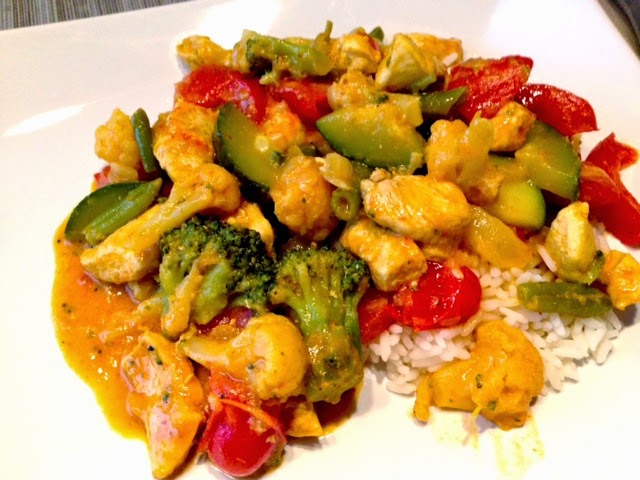 Siinä ne taisi olla kaikki ainekset. Kanafileet suikaloin ja paistoin kookosrasvassa mausteiden ja sipulin kanssa. Lisäsin kasvikset ja viimeisenä kookosmaidon, suolan, tomaattipyreen ja tomaatit.