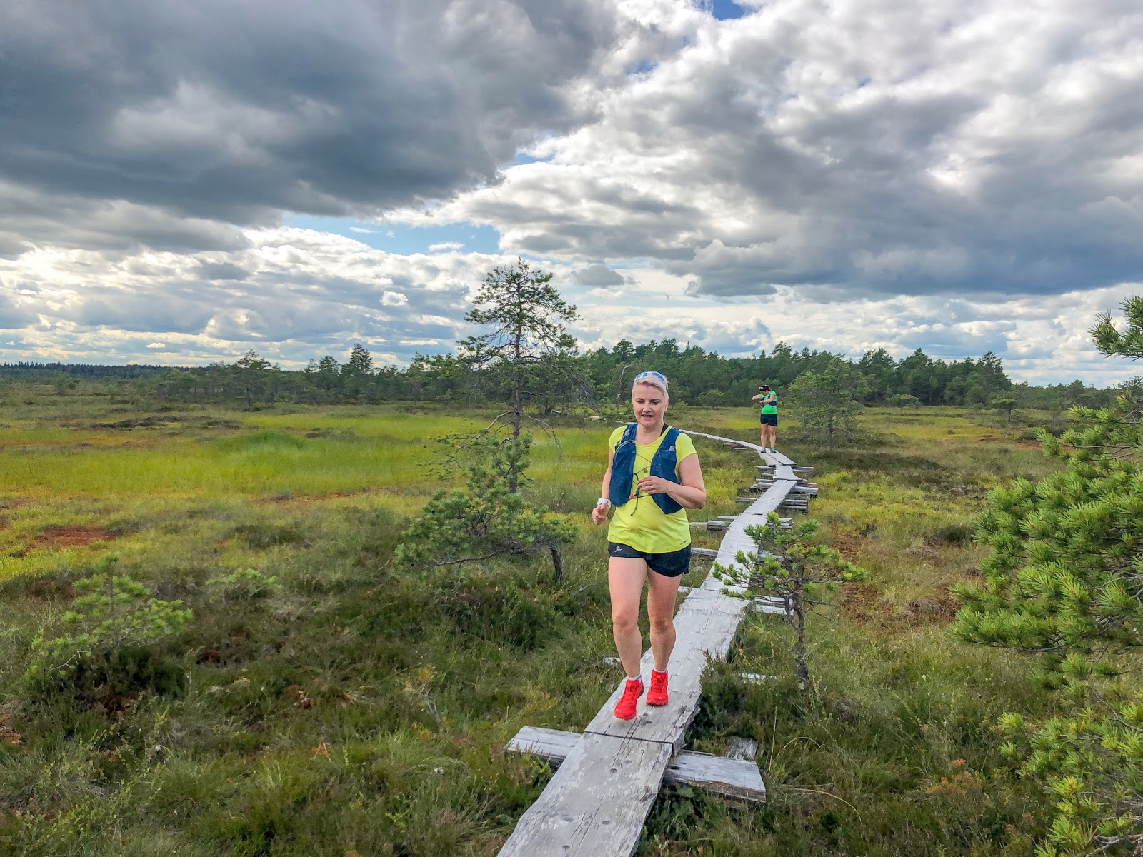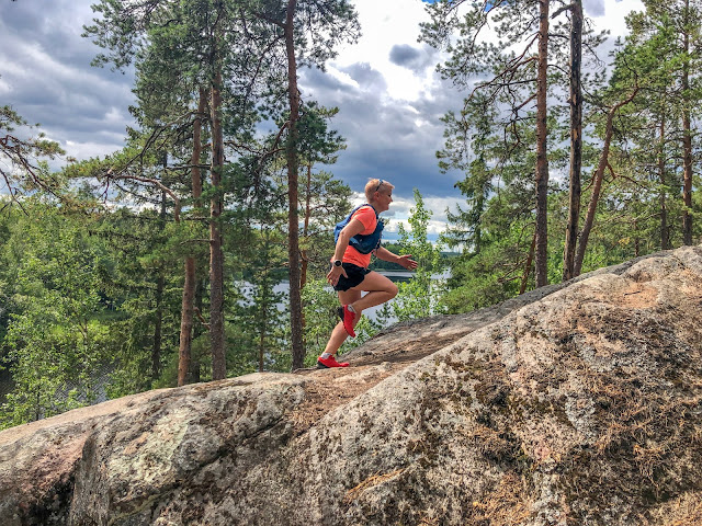 Auto jätettiin parkkiin Liesjärven kansallispuistossa Pirttilahden parkkialueelle ja napattiin Salomonin adv skin5-juomaliivit selkään. Matkaan lähdettiin kevyttä vauhtia ja ihailtiin samalla mahtavia maisemia. Reitti oltiin suunniteltu etukäteen ja tallennettu Suunnon urheilukelloon.