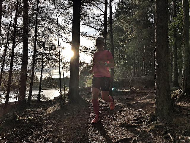 Syksyllä ostin polkujuoksukengät ja alettiin miehen kanssa käydä pidempiä lenkkejä metsässä vähän ennen kuin maa jäätyi ja ensilumi satoi. Liukkaiden kelien tullessa ei enää lähdetty liukkaille kallioille tai pitkospuille. Pari kertaa käytiin talven aikana Ruissalon poluilla juoksemassa, koska siellä maasto oli kuitenkin aika hyvä juosta. Välteltiin pahimpia kallioita.