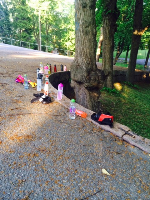 Lämpöasteita oli treenin alkaessa ainakin iPhonen mukaan +28 ja samaa se autonkin mittari näytti. Juomapullot oli onneksi tarttunut mukaan porukalla.