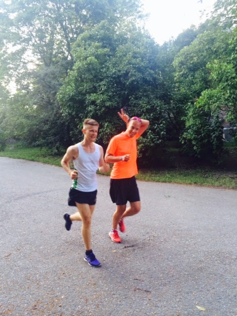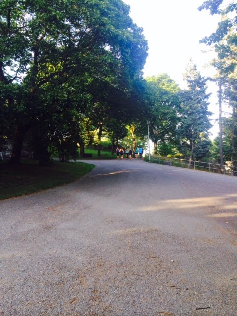 Pakko sanoa, että treenin alussa kauhistutti, kun Anni sanoi, että juostaan noin 40 minuuttia edestakaisin noita mäkiä aina paria vastaan. 40 minuuttia tässä kuumuudessa mäkitreeniä??? No kyllä vaan! Ei se loppujen lopuksi ollutkaan niin paha kuin miltä se kuvitelmissa vaikutti. Vasta toiseksi viimeisen kierroksen ja viimeisen kierroksen aikana tuntui siltä, että jalat ei välttämättä jaksa enää. Meinasin jopa kompuroida omiin kinttuihini portaissa viimeisessä nousussa.. Onneksi en sentään kompuroinut. Olisi ollut kiva mennä töihin huomenna naama ja polvet ruvella. Eikä edes DBTL ole vielä alkanut 😀