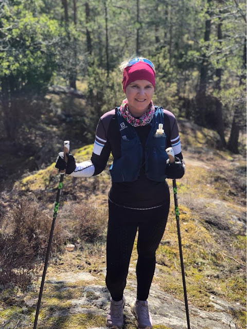 Lauantaina treenin aikana aurinko lämmitti jo ihanasti ja pitkähihainen tekninen paita oli aivan riittävä trikoiden kaverina. Alussa päällä ollut ohut juoksutakki sai siirtyä juoksuliivin taskuun säilöön.