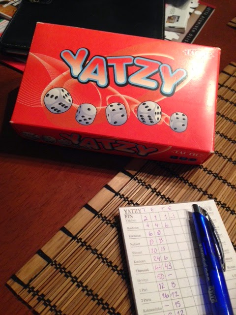 Perjantai-illalla pelattiin Yatzya, joka kuopuksenkin mielestä on kiva peli, koska sen voi voittaa kuka tahansa pelaajista. Ilta meni muutenkin rauhassa vielä pientä flunssaa potien. Esikoinenkin pääsi lomille armeijasta taas oltuaan kotona viimeksi kaksi viikkoa sitten.