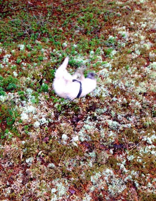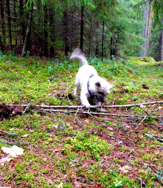 Juoksenteli edestakaisin ja haisteli kaikkea, pyöri sammaleella ja repi oksia.