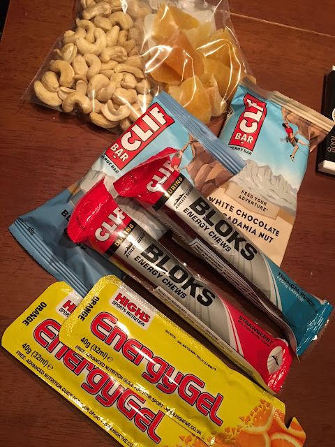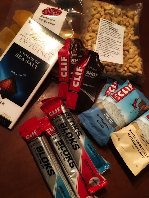 Geelien ja kuutioiden lisäksi polkulenkeillä jotka on yli 2 tuntia pitkiä kulkee mukana useimmiten joku energiapatukka, cashewpähkinää, rusinaa tai uusi suosikki, kuivattua mangoa, Lindtin tummaa suklaata, joka on maustettu merisuolalla. Suolaahan on myös hyvä saada energian lisäksi pidemmillä lenkeillä ja joskus valitsen myös cashewpähkinät kuivapaahdettuina ja suolattuina.