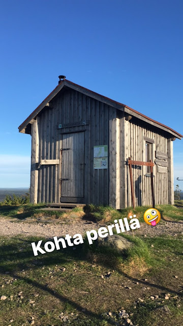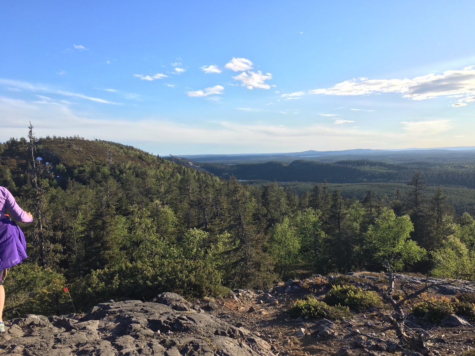 Toisen huollon jälkeen maaliin oli enää reilu 5 km matkaa, mutta aikaa siihen matkaan kului paljon. Tiedossa oli, että reitin pahimmat nousut osuvat juuri noille viimeisille kilometreille. Edessä oli nousu Valtavaaralle. Sari oli varoittanut, että ei kannata lannistua, vaikka ennen Valtavaaran mökkiä tulee muutama nousu ja lasku. Ja niinhän se oli, juuri kun odotit olevasi ”mökkihuipulla” lähtikin polku taas laskemaan alamäkeen. Edessä uusi nousu ja uusi lasku. Jossain vaiheessa sekosin laskuissa ja enää en ole varma oliko tuo mökkihuippu kolmas, neljäs vai viides huippu 😀 Mutta näkymät oli mahtavat! Valtavaaran huipulta näkyi jo Rukan hyppyrimäki, mutta se näytti olevan niin kaukana vielä. Matka ei pitänyt olla kuin pari kilometriä, mutta se näytti vähintäänkin viideltä. Ja kun katsoi oikein tarkkaan, näki Valtavaaran ja Rukan välissä vielä yhden pienemmän nyppylän, jonka yli oli kavuttava. Tuossa vaiheessa uskalsin kuitenkin jo melkein tuulettaa, otin kuvan jonka latasin Instaan heti ja tekstiksi tuli, ”kohta perillä”.