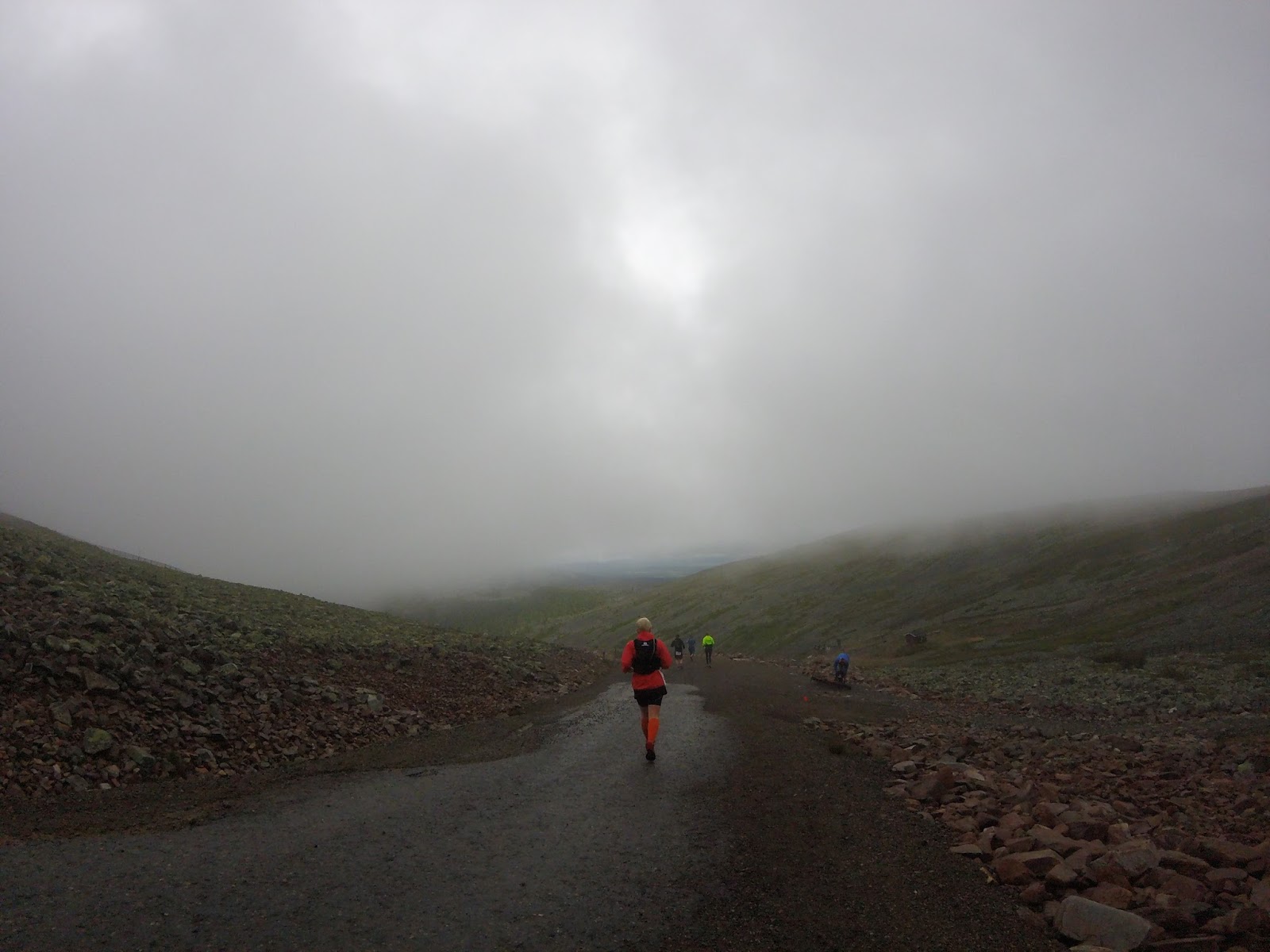 Ei muuta kuin katse eteenpäin, tai oikeammin sanottuna ylöspäin. Lähtöalue oli Hotelli Saagan alapuolella ja ensimmäinen etappi oli kivuta ylös Ylläksen huipulle. Yhteensä nousua tuli lähdössä reilun 3 kilsan pätkä, korkeutta reilu 400 metriä. Sumu oli paikoitellen niin paksu, ettei nähnyt kovinkaan kauas eteenpäin. Juuri kun luulit päässeesi huipulle oli kulman takana taas uusi nousu.