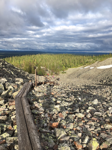 Kesänkitunturin juurella tiedettiin, että matkan seuraava haaste on edessä. Otettiin kuoritakit pois päältä ja lähdettiin kapuamaan ylös pitkin Pirunkurua. Alkumatkasta päästiin nousemaan pehmeää polkua pitkin, mutta ehkä noin puolivälissä nousua alusta muuttui täysin. Edessä oli kivilohkareita, joiden päällä piti taiteilla, kiivetä ylöspäin ja samalla tasapainoilla. Välillä mentiin melkein nelivetoa ja tuossa vaiheessa lämpötila alkoi jo aiemman sateen jäljiltä kohota, mutta ilman kosteusprosentti oli todella korkea. Hengitys vaikeutui hieman ja oli pakko vetää henkeä puolisen minuuttia. Odotin tiheämmän letkan menevän ohi ja hyppäsin jonon jatkeeksi. Sain pysähdyksestä tarpeeksi virtaa ja jaksoinkin hyvin ylös saakka. Mies oli jäänyt Kesängin huipulle odottelemaan ja jatkettiin taas matkaa yhdessä. Kävi kyllä mielessä, että olisin käskenyt jatkaa matkaa.
