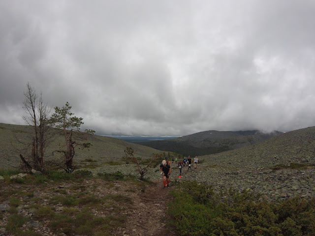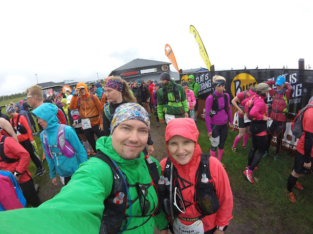 Kuten yleensä tunturissa voi sää muuttua hetkessä, näin myös tällä kertaa. Lähtölaukaus piti kuulua klo 16, mutta 5 minuuttia ennen lähtöä pyyhkäisi lähtöalueen ja Ylläksen huipun yli ukkosmyrsky, joka laittoi lähtöalueen uuteen järjestykseen. Lähtöä siirrettiin 20 minuuttia ja lopulta päästiin lähtemään pienessä tihkusateessa. Onneksi oli otettu mukaan ohuet kuoritakit, jotka pitivät vettä ja tuulta tarpeeksi hyvin. Juuri ennen starttia laitoin vielä hupun päähäni ja otin aurinkolasit pois pään päältä. Nuo lasit asettelin kiinni juoksuliivini yhteen silmukkaan, mutta jotenkin ne pääsivät putoamaan. Huomasin niiden puuttuvan noin parisataa metriä startin jälkeen ja tiesin, että en niitä enää näkisi. Harmi sinänsä, olin juuri löytänyt hyvät lasit juoksuun ja pyöräilyyn.