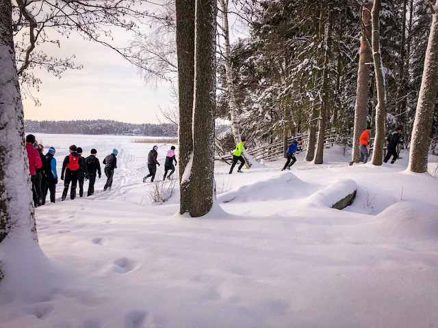 Kärkijoukko sai tehdä takana tulijoille polkua, kun välillä mentiin lähes umpihangessa. Itse jäin letkan loppupään joukkoihin ja silti meinasi välillä vauhti hyytyä, kun pehmeä lumi luisti kengän alta. Pohkeet oli lujilla, kun tarvottiin menemään.