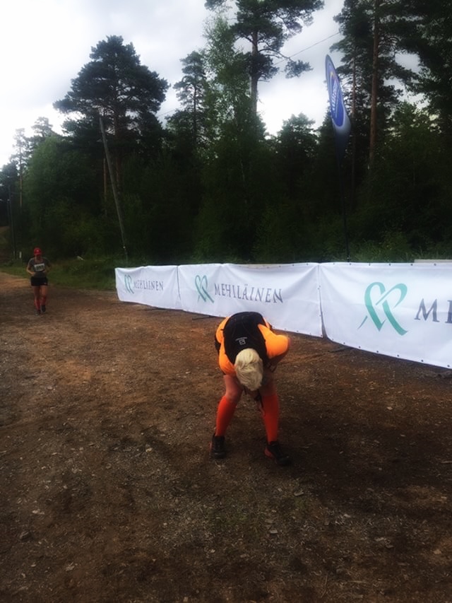 Vähän viimeisen huoltopisteen jälkeen näin edessäni jonkin matkan päässä juoksevan naisen. Yhtäkkiä kuuli kovan huudon ja kiroilun ja tajusin, että en näekään naista enää. Lisäsin vauhtia ja löysin hänet maasta makaamassa ja piteli polveaan. Trikoot oli polvesta rikki ja hän oli kaatunut pehmeässä hiekassa oleviin suurempiin kiviin ja iskenyt polvensa kiveen. Jäin vierelle varmistamaan, että hän pääsi ylös, kävelin hetken vierellä ja lopulta nainen jatkoi matkaa myös hölkäten. Pääsi pienemmällä vammalla kuin mitä pelkäsi. Itse jatkoin matkaa maalia kohti vuorotellen kävellen ja juosten. Maalialueella törmäsin samaan naiseen vielä, kun istuin syömässä ja sain kuulla, että ea-pisteellä polvi oli putsattu kunnolla hiekasta ja kivistä, teipattu perhosteipeillä ja suojattu lapulla.