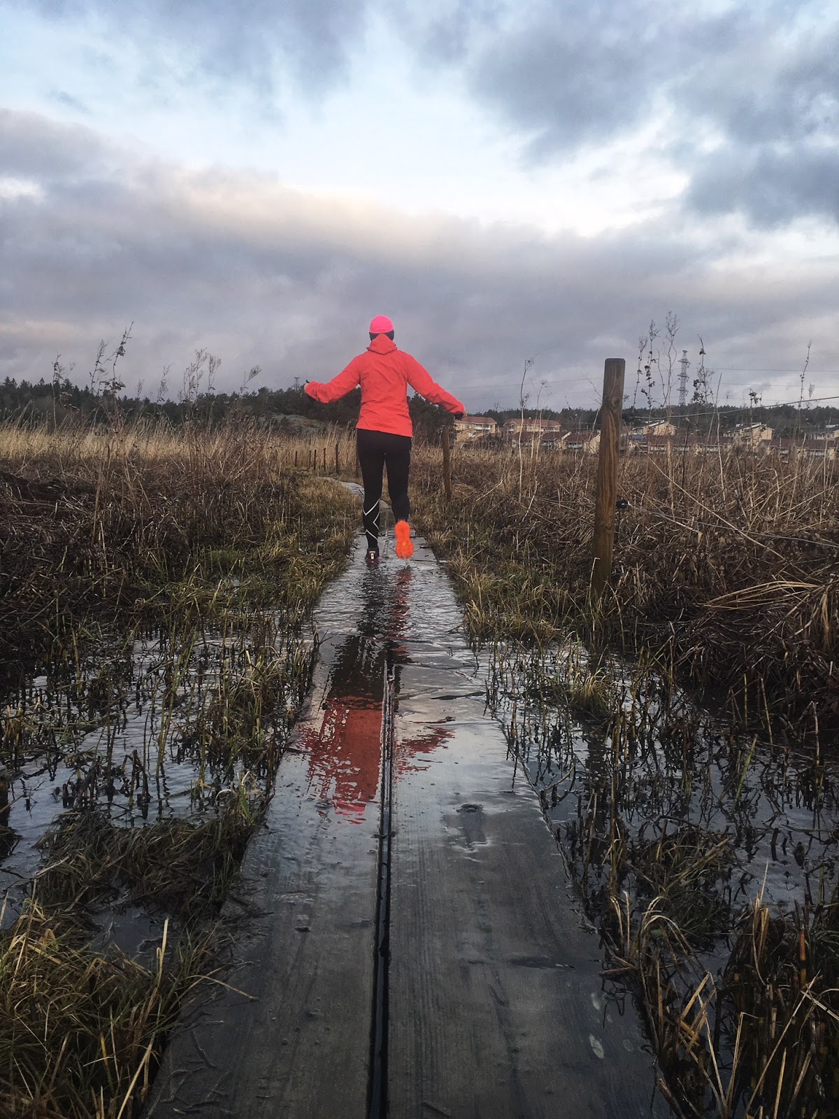 Lauantaina aamulla lähdettiin heti aamupäivästä myös Vauhtisammakon järjestämälle polkujuoksukurssille ja tarkoituksena oli käydä Vaarniemen näköalatornilla, mutta ihan sinne saakka ei päästy. Viime aikojen vesisateet on nostaneet merivedenkin niin korkealle, että pitkospuut olivat veden peitossa sen verran, että ei uskallettu porukalla lähteä menemään. Vähän matkaa kokeiltiin, mutta siinä vaiheessa, kun pitkokset olivat kokonaan veden peitossa kymmenen metrin matkalta, käännyttiin takaisin päin.