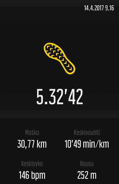 Polkujuoksulenkistä tuli kyllä ikimuistoinen ja kotona päästiin onneksi saunaan. Ja olihan tämä eka pitkä lenkki maaliskuun alun jälkeen. Tankkaus meni nappiin ja muutenkin olen ihan tyytyväinen, vaikkakin välillä jouduttiin kävelemään.