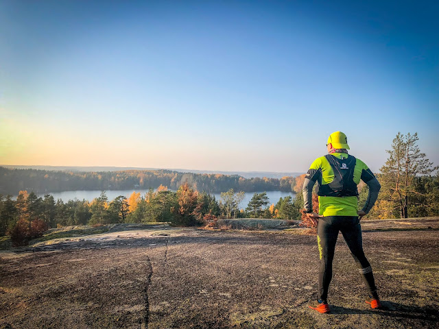 Jalkaan tarttui kaapista Salomon Fast Wing-juoksutrikoot. Arvostan noissa housuissa taskujen määrää, on taskua vetoketjulla ja ilman. Taskuja on riittävän monta ja välttämättä ei mukana tarvitsisi reppua lainkaan vaikka menisi hieman pidemmänkin lenkin poluilla, sillä taskuihin mahtuu hyvin avaimet, lisäenergiat ja pieni juomapullokin menee ja jos housujen taskut loppuu kesken niin Salomonin paidassani on myös pieni tasku johon saa vaikka geelit tai patukat.