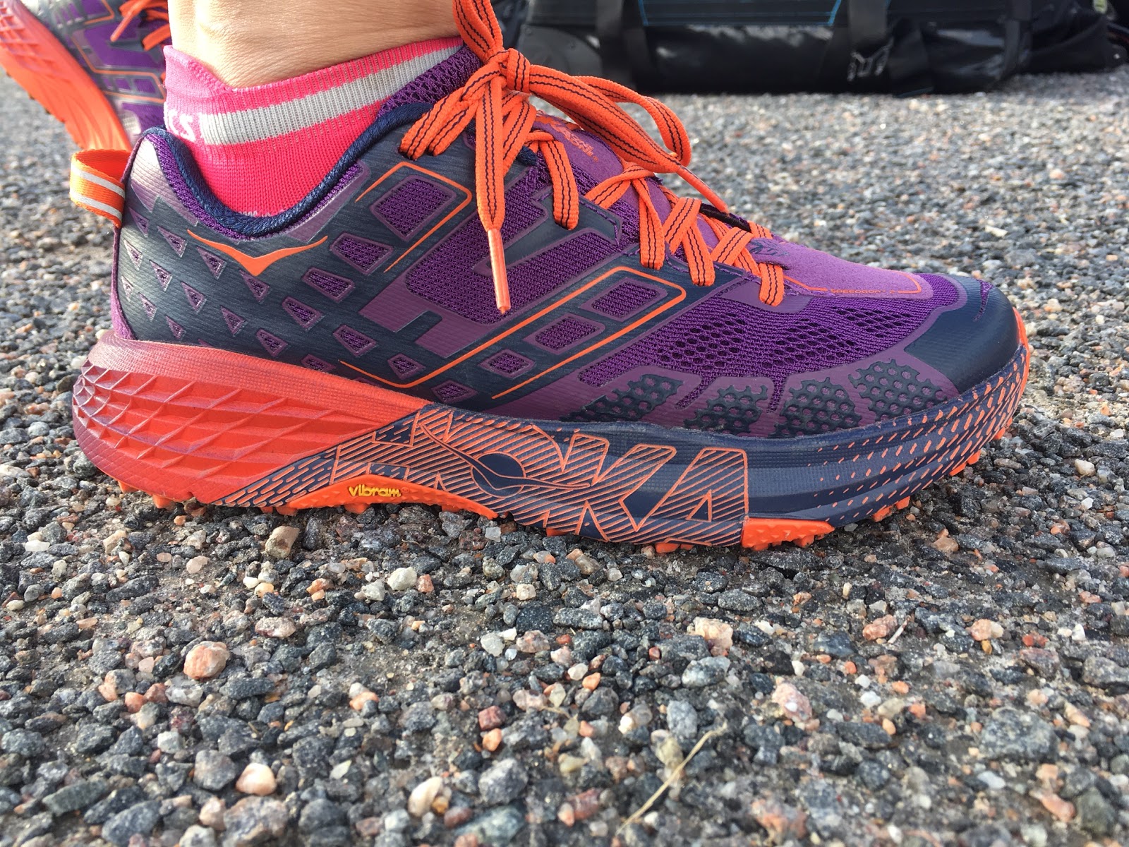 Nyt, kun keväällä on edessä ensimmäineen polku-ultra, panostin vielä toiseen pariin polkukenkiä ja tällä kertaa sain suosituksen testata Hoka One Onen Speedgoat 2 kenkää. Ihastuin myös siihen kenkään täysin! Pitävyys ainakin märällä kalliolla ehkä hieman parempi kuin Salomonilla. Ja vaimennus on todella hyvä.