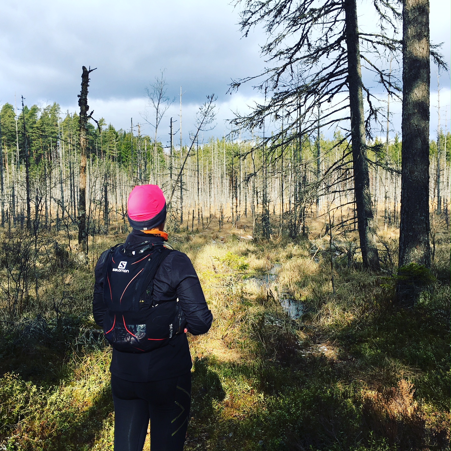 Polkujuoksussa joutuu maastoa ja reittiä analysoimaan koko ajan. Pitää tehdä nopeita päätöksiä, kierränkö kiven vai hyppäänkö yli, astunko puun rungon päälle ja hyppään nopeasti yli vai hiljennänkö ja kiipeän varovasti. Matkalla tulee usein vastaan ojia ja puroja, suomaastoa ja muita vesiesteitä. On osattava lukea näitä esteitä, jotta tietää voiko hypätä yli vai meneekö suosiolla suoraan läpi tai yrittääkö kiertää. Alkuun yritin itse aina päästä kaikkien esteiden ohi kastelematta jalkoja, mutta olen todennut sen olevan aivan turhaa, koska jalat kastuvat jossain vaiheessa lenkkiä joka tapauksessa 😀