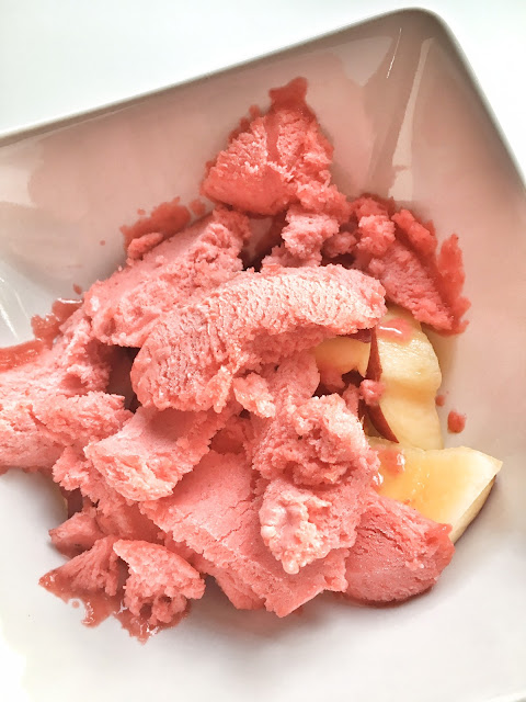 Ensin tuli vastaan vuosi sitten tekemäni Mansikka-Raparperisorbetti. Herkullista sellaisenaan, mutta myös vaikka uunissa paistettujen nektariinien kanssa.