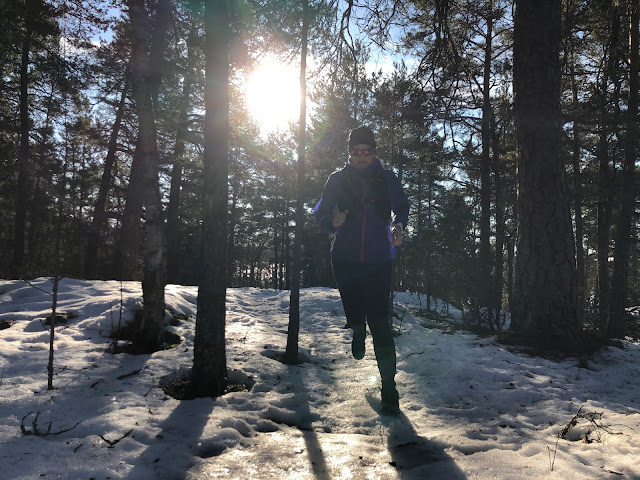 Polut oli suurimmalta osin jo keväisessä kunnossa. Lumi oli pehmentynyt ja melkein olisi jo pärjännyt polkujuoksukengillä ilman nastoja, mutta koska kyseessä on metsäinen maasto varjopaikkoineen, nousuja ja laskuja, päätin ottaa varman päälle ja lähdin liikkeelle nastakengissä. Ne olikin ihan hyvä valinta, sillä muutamassa alamäessä ei olisi uskaltanut juosta ilman nastoja.