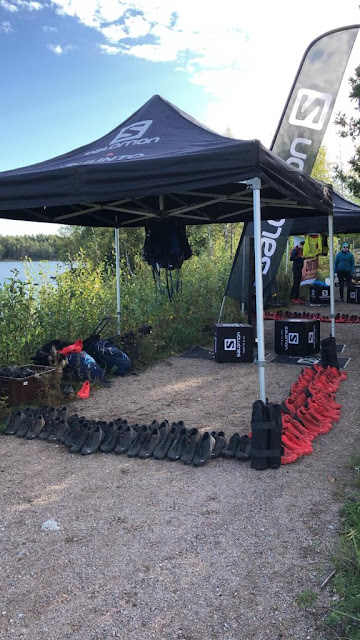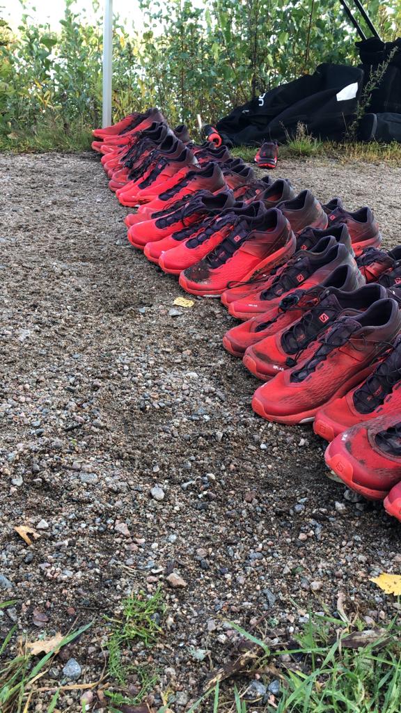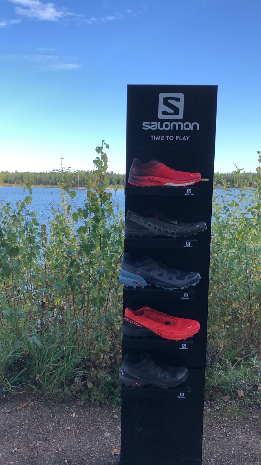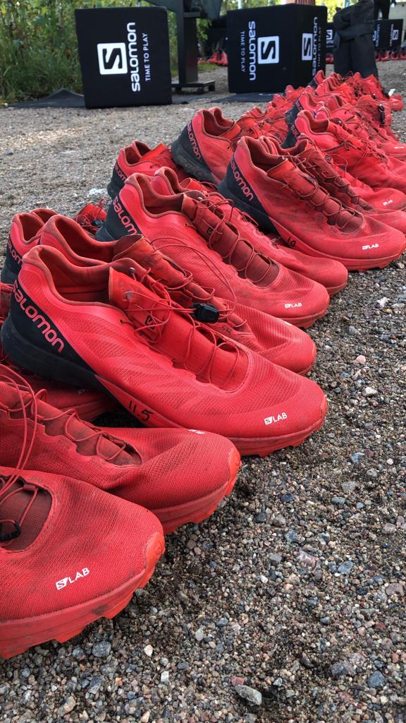 Paikalle saapui reilu 50 testaajaa, jotka ennen lenkkiä saivat jalkaansa sopivan kokoiset Salomonin testikengät sen mukaan minkälaista kenkää haettiin. Mukana Salomonilta oli pari mallia vähemmän vaimennettua kisakenkää, Speed2 ja S-Lab Sense 7SG ja pari mallia enemmän vaimennettua, S-Lab Ultra2 ja Speedcross5. Nämä kaikki soveltuvat hyvin polkujuoksuun.