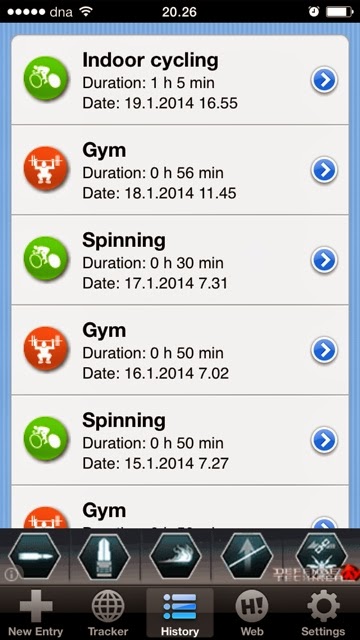 Vieressä mun oma tilasto viime viikolta. Alimmaisesta näkyy vain otsikko, mutta sekin on viime viikolta, maanantailta. Tiistai näytti olleen välipäivä, kuitenkin tein kotona kehonhuoltoa venyttelynä.