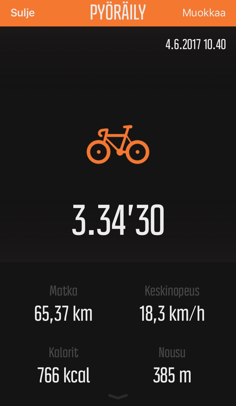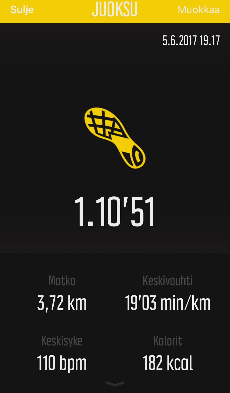Ihan kaikista ensimmäinen tapahtuma omassa Movescountissani on 17.2.2014 juostu 4 km lenkki, johon aikaa meni 29 minuuttia. Se oli yksi niistä monista lähipururadalla juostuista lenkeistä ennen Vauhtisammakon juoksukouluun tutustumista. Huomasin myös, että tuolloin alkuun käytin Suunnon urheilukelloa lähes kaikessa liikkumisessa, kun se nykyään on lähestulkoon vain juoksussa ja pyöräilyssä mukana. Jatkossa on tarkoitus ottaa se taas käyttöön ihan kaikessa liikunnassa.