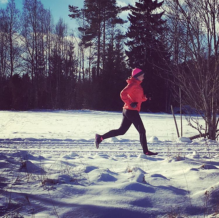 Yläkropan suojasin pitkähihaisella paidalla, joka oikeastaan on hiihtopaita, sen päälle vedin lyhythihaisen juoksupaidan ja kuoritakin. Myös talvella on erittäin tärkeää, että juoksuvaatteet on hengittäviä ja kannattaa silloinkin suosia urheiluvaatteita. Kuoritakkia käytän vain jos on luvattu vesi- tai räntäsadetta, koska se ei hengitä kovinkaan hyvin, mutta pitää muut vaatekerrokset kuivina ja myös tuulen ulkopuolella. Kaulaan laitan jo tässä vaiheessa kautta buff-liinan, koska astmaatikkona pitää kaula suojata hyvin, jotta välttyisi turhilta hengitysvaikeuksilta. Sen saa myös kätevästi nostettua hengityssuojaksi suun ja nenän yli. Lisäksi olen jo ottanut käyttöön ohuen pipon ja hanskat.