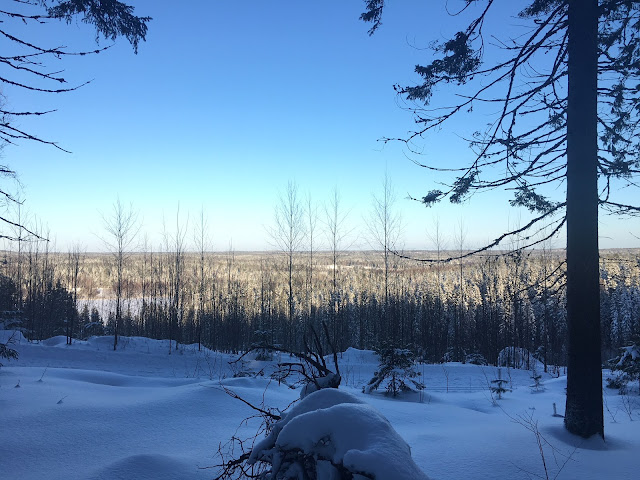 Ensimmäisenä päivänä lähdettiin hieman eri paikasta ja käveltiin yhteensä reilu 4 kilsaa lumihangessa auringon paistaessa puiden välistä. Keli oli mahtava, juuri sopiva talviloman viettoon ja rentoutumiseen metsän keskellä.