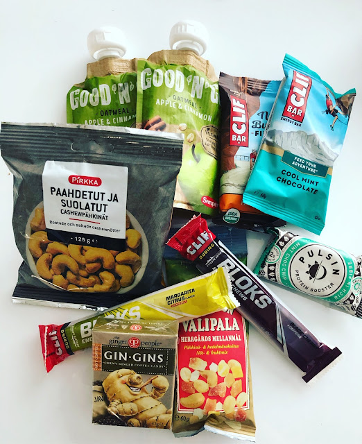 Alunperin ajattelin ottaa vähemmän geelejä ja enemmän sellaista joka myös täyttäisi enemmän. Sain kuitenkin todeta, että vaikka en geeleistä pidäkään vievät ne vähiten tilaa ja painavat vähiten. Vaihdoin siis yhden puuron ja pari patukkaa geeleihin.