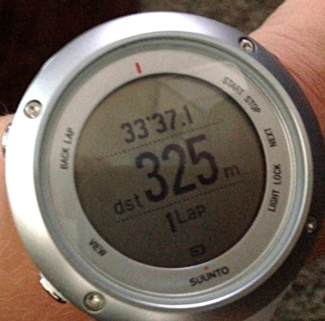 Mulla oli mukana mun uusi sykekello, Suunnon Ambit2 S White, ja se oli tosi hyvä tuossa uinnissa, kun se menee itsestään paussille kun liike pysähtyy. Ei siis ota aikaa kun välillä huilaa radan päässä. Sykevyötähän en veteen ottanut, ainoastaan tuon kellon.