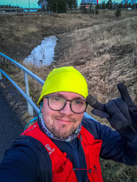 Ensimmäiset pari kilometriä meni vähän kroppaa herätellessä mutta kyllä se siitä sitten lähti. Vauhti oli maltillinen, noin kutosen vauhtia ettei jalat mene päivän aika tukkoon ja jaksaa kotiinkin juosta. Vaatetta tuli heitettyä päälle aivan liikaa sillä mittari taisi näyttää jo aamusta +4.