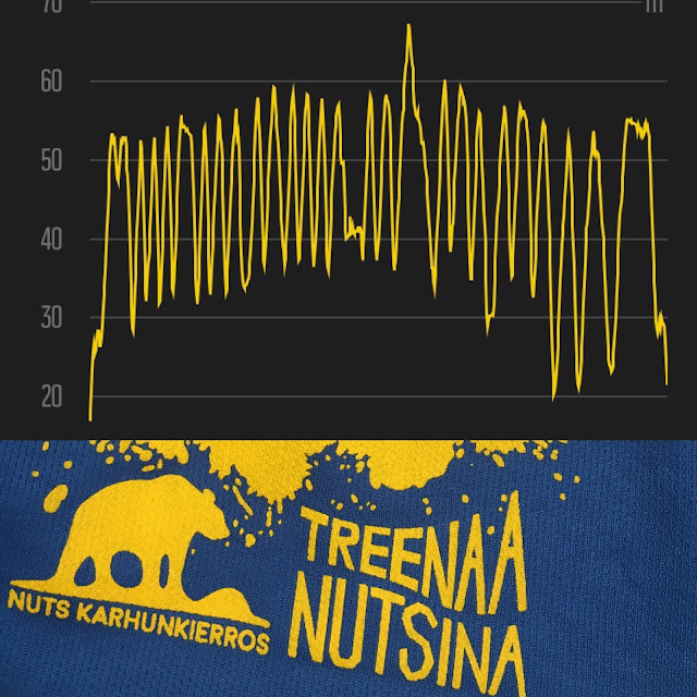 Juoksutreeneissä kului menneellä viikolla kauemmin aikaa kuin normaalisti, sillä kävin tiistaina ja torstaina juoksemassa tuplatreenit. Salilla tuli käytyä vain kerran, mutta perjantaina saatiin lihaksillekin kyytiä, kun suoraan töistä lähdettiin juoksemaan ylä- ja alamäkiä Muikkuvuorelle. Aikaa meni 2,5 tuntia ja matkaa taittui 9,8 kilsaa, josta nousumetrejä saatiin kasattua 585 metriä.