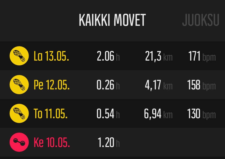 Pääasiassa tein kehonhuoltoa ja yhden salitreenin. Lisäksi, koska eilen kävin juoksemassa HCR:llä, piti käydä pari juoksulenkkiä ennen viikonloppua. Ne jäivätkin ihan loppuviikolle ja aika lyhyiksi.