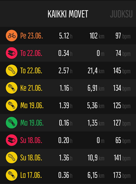 Katsoin juuri Movescountista menneen viikon juoksut ja pyöräilyt. Mitään muuta treeniä en olekaan tehnyt, paitsi tietysti venyttelyitä.
