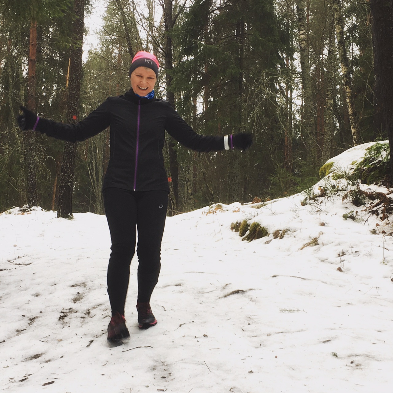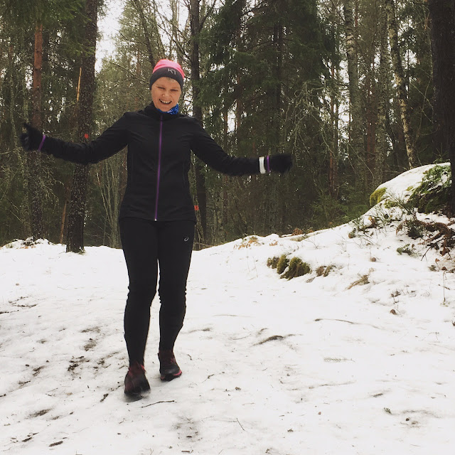 Pyöräilemään pääsee pyöräteillä ihan hyvin. Nastat auttaa siellä missä jäätä on vielä. Juostessakin on vielä ollut nastat käytössä, vaikkakin nyt pääsisi varmaan jo ihan hyvin ilman nastojakin etenemään. Ainakin jos menee pitkin pyöräteitä. Eilisellä metsälenkillä oli kyllä hyvä olla nastat. Liukkaat polut olisi muuten vieneet voiton. Edellisen viikonlopun aurinkokin pysytteli näkymättömissä tällä kertaa ja ilma oli tasaisen harmaa, mutta se ei menoa haitannut.