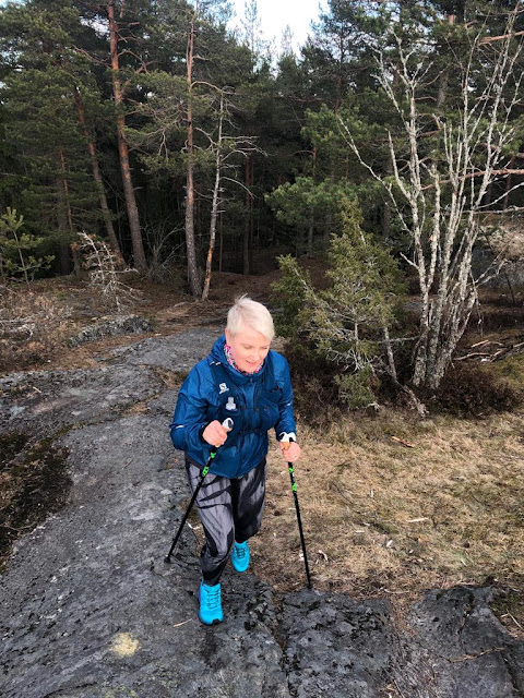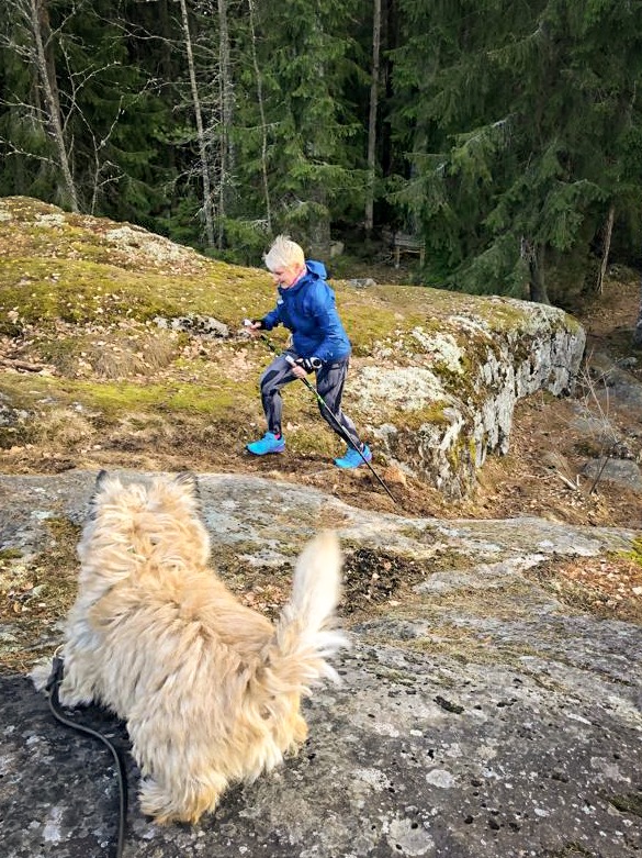 Perjantaina työpäivän jälkeen söin kevyesti, vaihdoin juoksukamat päälle ja lähdettiin koko porukan kanssa lähistön metsään. Mies ja kuopus ulkoiluttivat koiraa sen aikaa, kun minä menin mäkiä ylös ja alas. Mukaan otin myös nuo edellä mainitut sauvat, jotta sain treenattua niiden kanssa ylämäkeen tunkkausta. Vielä en ole päättänyt otanko ne mukaan myös Karhunkierrokselle vai en. Olisihan niistä varmaan hyötyä varsinkin loppumatkan ylämäissä, mutta haluanko sittenkään kantaa niitä mukana koko matkan ajan.