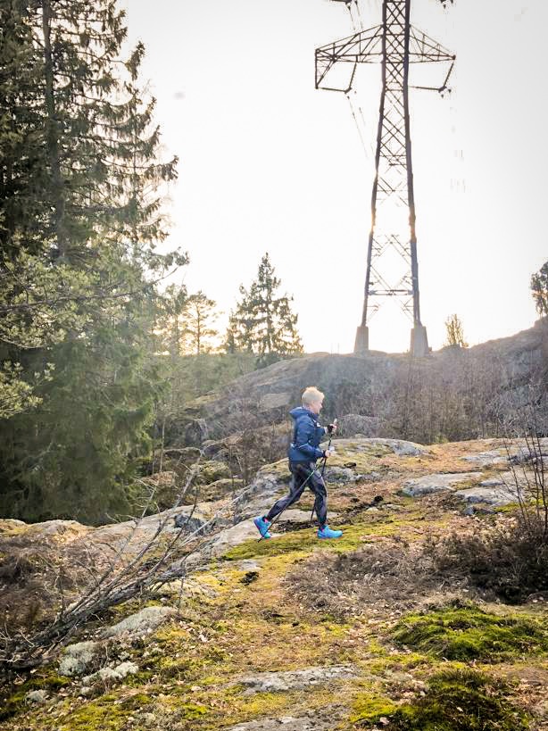 Koska itse en ihan hirveän paljon ole tukeutunut noihin sauvoihin poluilla juostessa ajattelin nyt aloittaa, jos vaikka jossain vaiheessa olisi sellainen lenkki edessä, että niitä ihan oikeasti tarvitsee. Alamäessä sauvat vain kulkevat mukana osoittaen takaviistoon. Omani ovat myös teleskooppi-mallia, joten saan laitettua ne kasaan jolloin ne voi laittaa vaikka juoksuliiviin roikkumaan. Niille on olemassa ihan omat kiinnikkeensä liivissä.