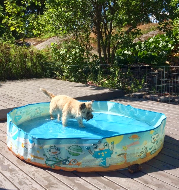 Toinen viilennyskeino meillä on lasten kahluuallas. Lapset on jo sen verran isoja ettei ne enää altaassa pahemmin loju, joten Pontus saa pitää koko altaan itsellään. Siellä onkin kiva kahlailla välillä, ja tietysti sen jälkeen tulee ihan hirvee hepuli ja kaveri juoksee ympäri olohuonetta ja kuivailee itseään mattoon. 😀 Taitaa olla aika yleistä koirilla nuo hepulit suihkunkin jälkeen, ainakin mitä olen tutuilta koiranomistajilta kuullut.
