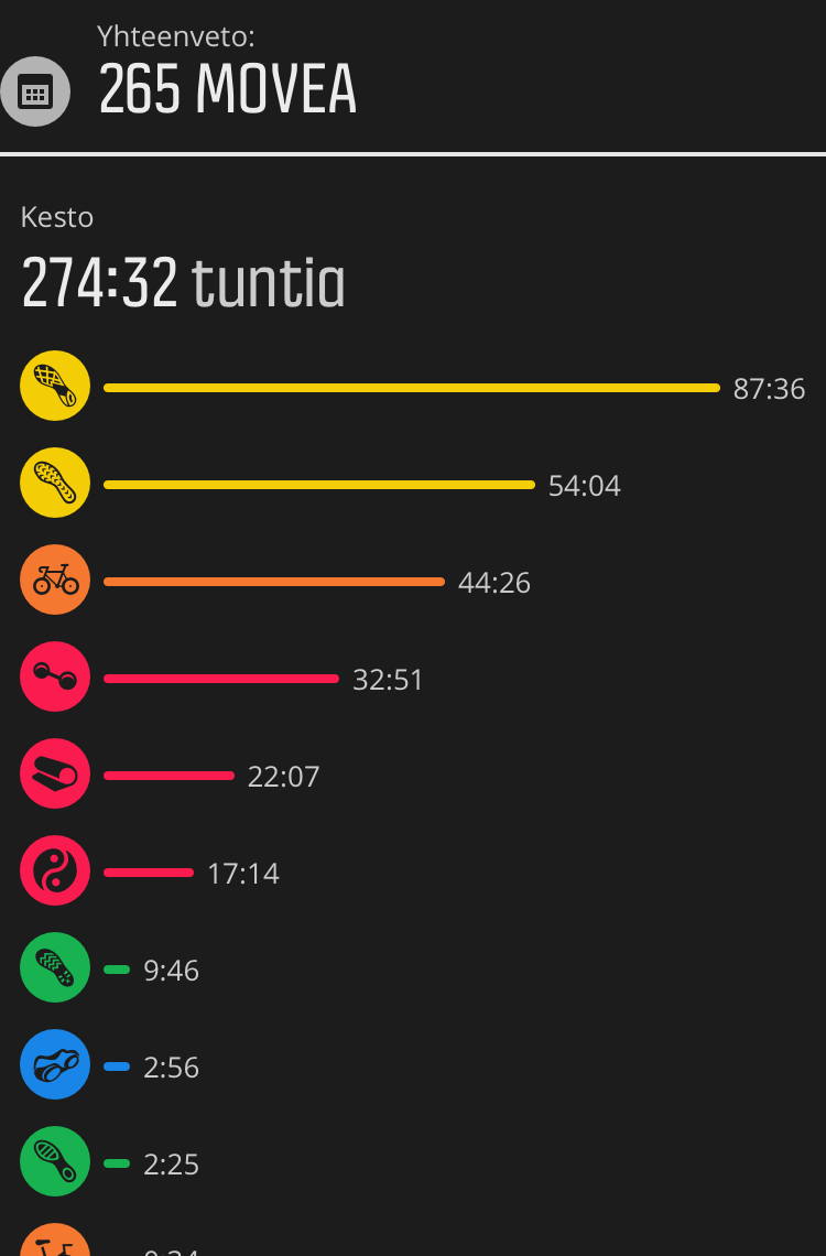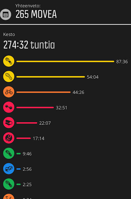 Näiden lisäksi on tullut treenattua salilla, käyty joogassa ja tehty kehonhuoltoa kotona useita tunteja.